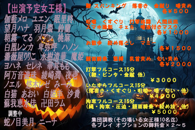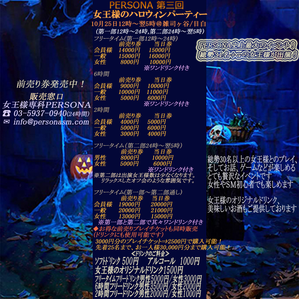 ◇PERSONAイベント共通◇ ●18歳未満の方の入場 ●20歳未満の方の飲酒、喫煙 ●暴力団関係者の入場 ●キャストや他のお客様へ迷惑行為や礼節を欠く行為 (他人の性癖批判、揶揄など含む) ●女王様へのプライベートの詮索 ●休憩中の女王様へ話しかける行為 ●キャストやお客様への軟派や勧誘行為 ●器物の破損や汚損 他のお客様やスタッフの私物に 無断で触れる行為 盗撮行為、及びスマホのカメラを無断でキャストや 他のお客様に向ける行為 ●泥酔 ●水以外の飲料の持ち込み 禁止事項をお守り頂けないとき、もしくはスタッフの 指示に従って頂けなかったときは滞在可能なお時間内 であっても退場していただく場合がございます。 (その場合、ご料金の返金は致しかねます) ※緊縛・絞め落としは飲酒後は危険ですのでご希望の 方は必ず飲酒される前に女王様にご依頼ください ※フリータイム以外のお客様で、一時会場から退場さ れ、時間を空けて再入場される場合は、必ず退場時に スタッフにお伝え頂き、リストバンドに退場時間の 記載をお受けください (時間の記載がない場合は再入場ができない場合が ございます) 事前予約 ご料金のお支払方法 口座振り込み、またはクレジットカード払い ご予約方法 お電話 03-5937-0940 E-mail:info@personasm.com |